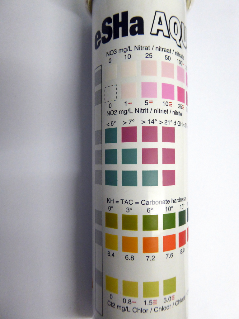 Um während der Einfahrphase die wichtigsten Wasserwerte im Aquarium festzustellen, hatte Ich mir zunächst einfache Streifentestes besorgt. Man liest zwar immer wieder, dass diese sehr ungenau sind, aber mich interessierten zu diesem Zeitpunkt auch noch keine genauen Messwerte. Ich denke es ist ausreichend, zunächst nur Veränderungen festzustellen, was damit recht einfach zu bewerkstelligen ist. Später kaufte ich dann ein Testset mit Tropftests.